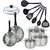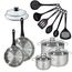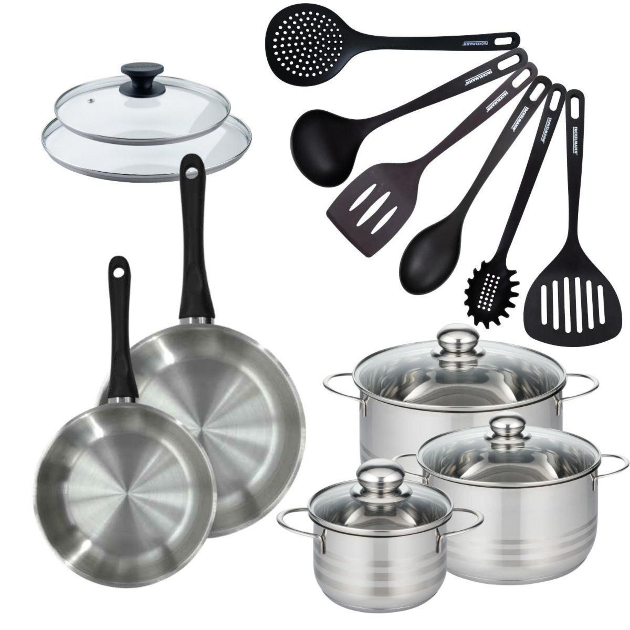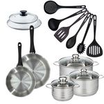 - DESCRIPTION: Set Fackelmann Geneva inox de 2 poêles 20 et 24 cm et couvercles, 3 faitouts inox de 16, 20 et 24 cm, et 6 ustensiles de cuisine en RPET