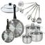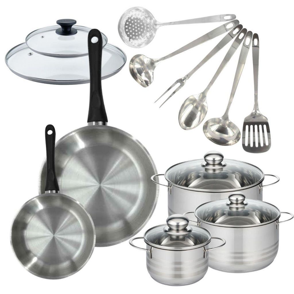 - DESCRIPTION: Batterie de cuisine Fackelmann Geneva inox de 2 poêles 20 et 28 cm et leurs couvercles, 3 faitouts inox de 16, 20 et 24 cm, et 6 ustensiles de cuisine en inox