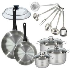 - DESCRIPTION: Batterie de cuisine Fackelmann Geneva inox de 2 poêles 24 et 28 cm et leurs couvercles, 3 faitouts inox de 16, 20 et 24 cm, et 6 ustensiles inox