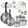 Set de 2 poêles 24, 28 cm inox, couvercles verre, 3 faitouts inox 16, 20 et 24 cm et 6 ustensiles inox Fackelmann Geneva
