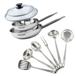 - COMPOSITION: Poêle en inox 18/8, couvercles en verre avec rebord en inox 18/10, ustensiles en inox, tous résistants et de haute qualité
