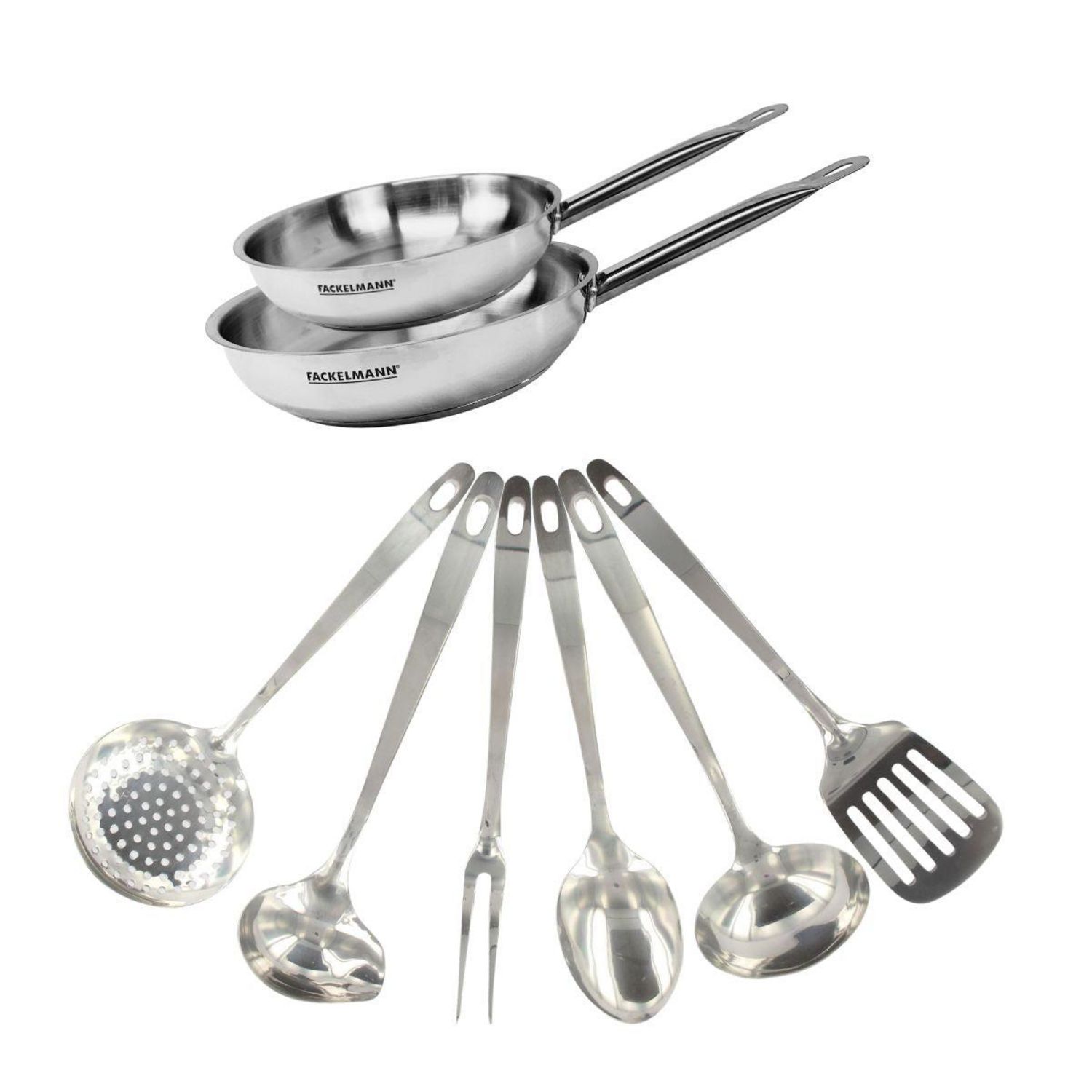 Set de 2 poêles de 20 et 24 cm en inox et 6 ustensiles inox Fackelmann Eterna