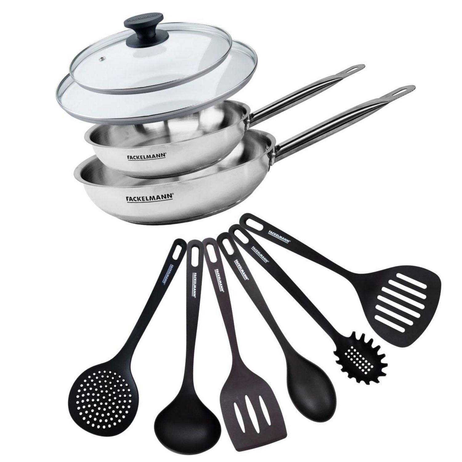 Set de 2 poêles de 24 et 28 cm en inox, 2 couvercles en verre et 6 ustensiles Fackelmann Eterna