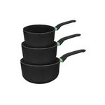 - DESCRIPTION: Lot de casseroles Fackelmann en aluminium recyclé, tailles 16, 18, et 20 cm, avec revêtement céramique antiadhésif sans PFAS