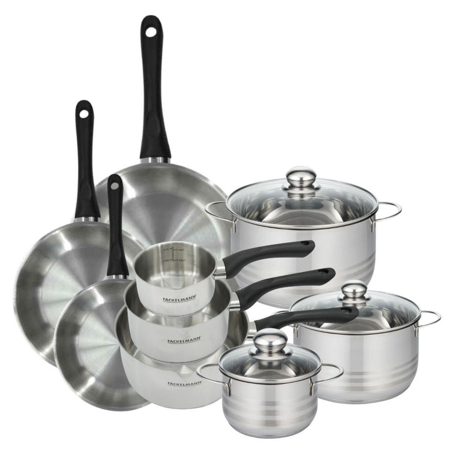 - DESCRIPTION: Batterie de cuisine complète sans PFAS Fackelmann comprenant 3 poêles de 20, 24 et 28 cm, trois casseroles (12, 16, 20 cm) en acier inox 18/8 et trois faitouts inox (16, 20, 24 cm)