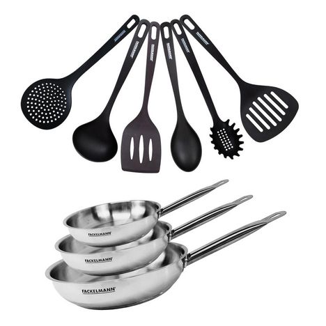 Set de 3 poêles 20 24 et 28 cm en inox et 6 ustensiles Fackelmann Eterna