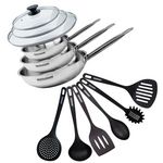 Set de 3 poêles de 20 24 et 28 cm en inox, 3 couvercles en verre et 6 ustensiles Fackelmann Eterna