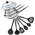 Avec 6 ustensiles résistants à des températures allant jusqu'à 210°C, compatibles avec le lave-vaisselle (louche, 2 pelles, cuillère, écumoire et cuillère à spaghetti en plastique recyclé noir). Couvercles à laver à la main.