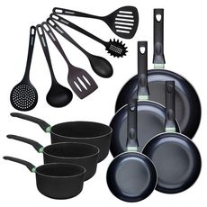 Set de 4 poêles 16 20 24 et 28 cm et 3 casseroles 16, 18 et 20 cm antiadhésives céramique et 6 ustensiles Fackelmann Brandao