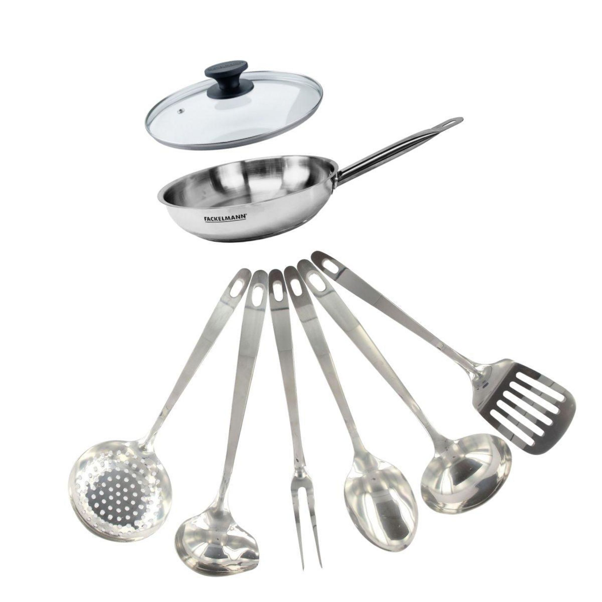 - DESCRIPTION: Set Fackelmann Eterna comprenant une poêle 20 cm en inox 18/8, son couvercle en verre et 6 ustensiles en inox pour une cuisine pratique et efficace