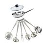 Complétées de 6 ustensiles de cuisson et de service robustes et élégants, en acier inoxydable : louche, louche ovale, cuillère de service, écumoire, fourchette à viande, pelle de service.