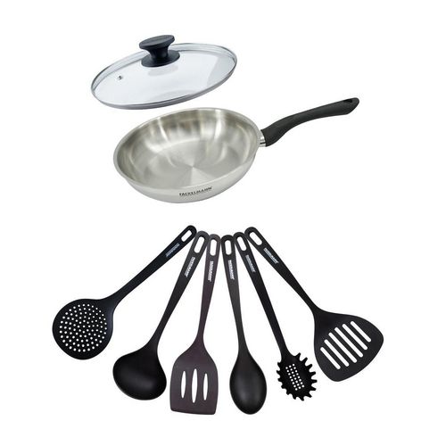 Set poêle 24 cm en inox, couvercle verre et 6 ustensiles Fackelmann Geneva