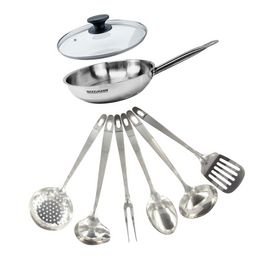 Set poêle 24 cm en inox, couvercle verre et 6 ustensiles inox Fackelmann Eterna