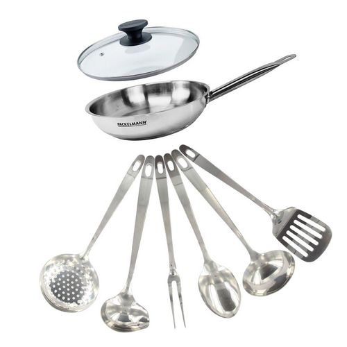 - DESCRIPTION: Set Fackelmann Eterna comprenant une poêle 24 cm en inox 18/8, son couvercle en verre et 6 ustensiles en inox pour une cuisine pratique et efficace
