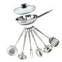 Accompagnée de 6 ustensiles de cuisson et de service élégants en acier inoxydable : louche, louche ovale, cuillère de service, écumoire, fourchette à viande, pelle de service.