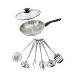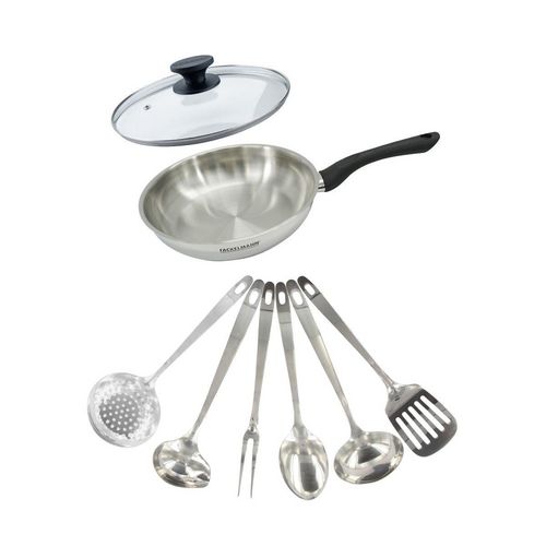 Set poêle 24 cm en inox, couvercle verre et 6 ustensiles inox Fackelmann Geneva