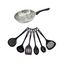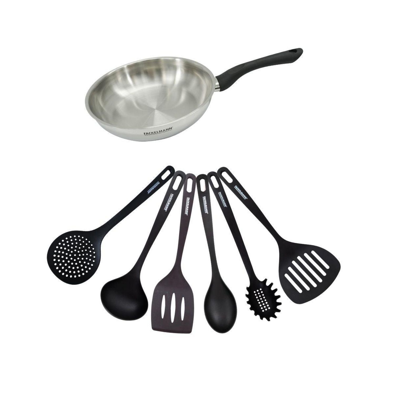 - DESCRIPTION: Set Fackelmann Geneva avec 1 poêle 24 cm en inox 18/8 et 6ustensiles de cuisine en RPET noir, parfaits pour une cuisine moderne