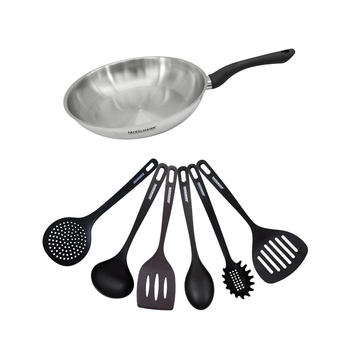 - DESCRIPTION: Ensemble Fackelmann incluant 1 poêle de 28 cm en inox 18/8 et 6ustensiles en RPET, parfait pour cuisiner et servir jusque 5 personnes