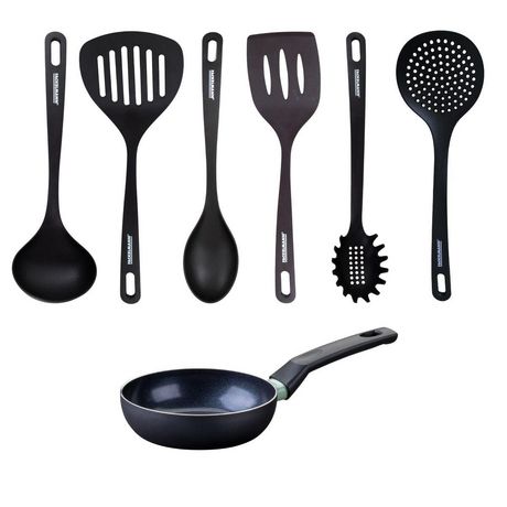 DESCRIPTION: Lot incluant une poêle de 16 cm et 6 accessoires en RPET, parfait pour cuisiner et servirPETIT +: Ensemble complet qui allie performance et praticité, idéal pour toutes vos recettesCOMPOSITION: Poêle en aluminium pressé recyclé, ustensiles en RPET, un plastique recycléDIMENSIONS: Poêle