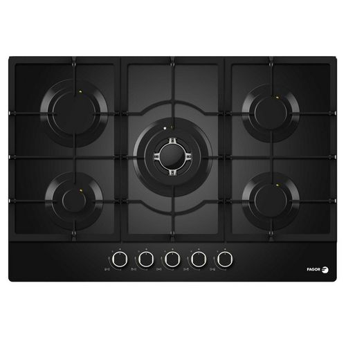 Fagor FAG6650N Table de cuisson gaz Fagor FAG6650N en verre noir. - Type de produit : Table de cuisson gaz dessus verre.Type de plaque : Gaz.Type d'encastrement : A recouvrement plan de travail.Energie : Gaz.Hotte intégrée : Non.Nbre foyer(s) : 5.Touche(s) sensitive(s) : Non.Type de commande(s) : Ma