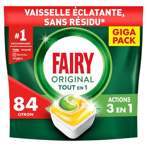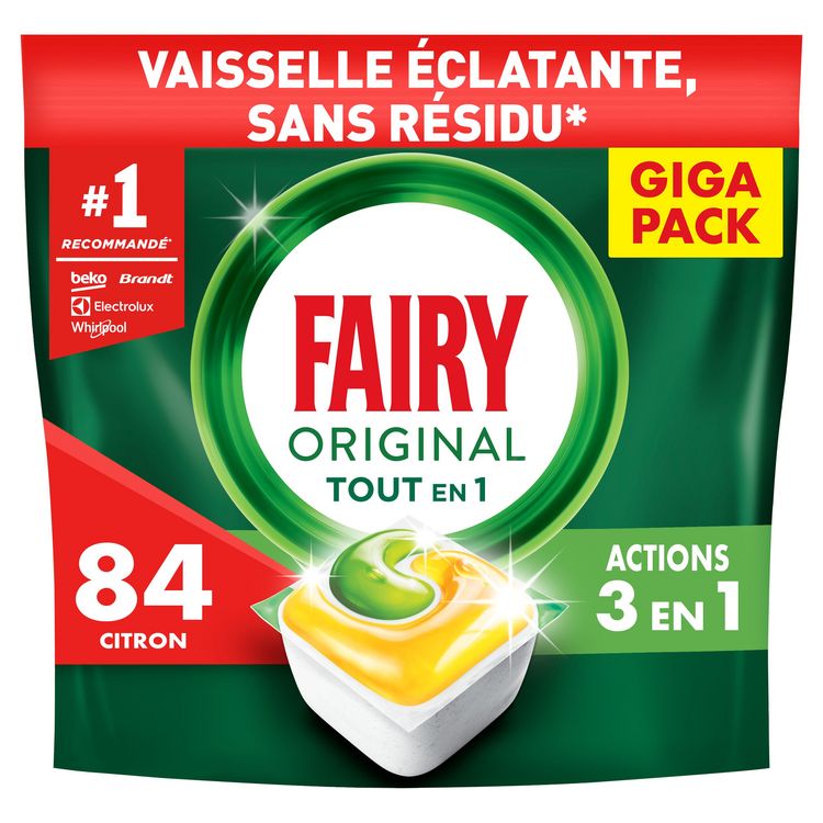 Les tablettes lave-vaisselle All in One Fairy Original nettoient dès le premier lavage. Elles sont même efficaces sur la graisse incrustée, pour une vaisselle éclatante. Fairy associe du liquide et de la poudre dans des capsules performantes. Leur sachet ultra-soluble se dissout rapidement, pour commencer à nettoyer sans délai. Et elles sont faciles à utiliser. Pas besoin de les déballer, placez-les simplement dans votre compartiment pour produit lave-vaisselle.