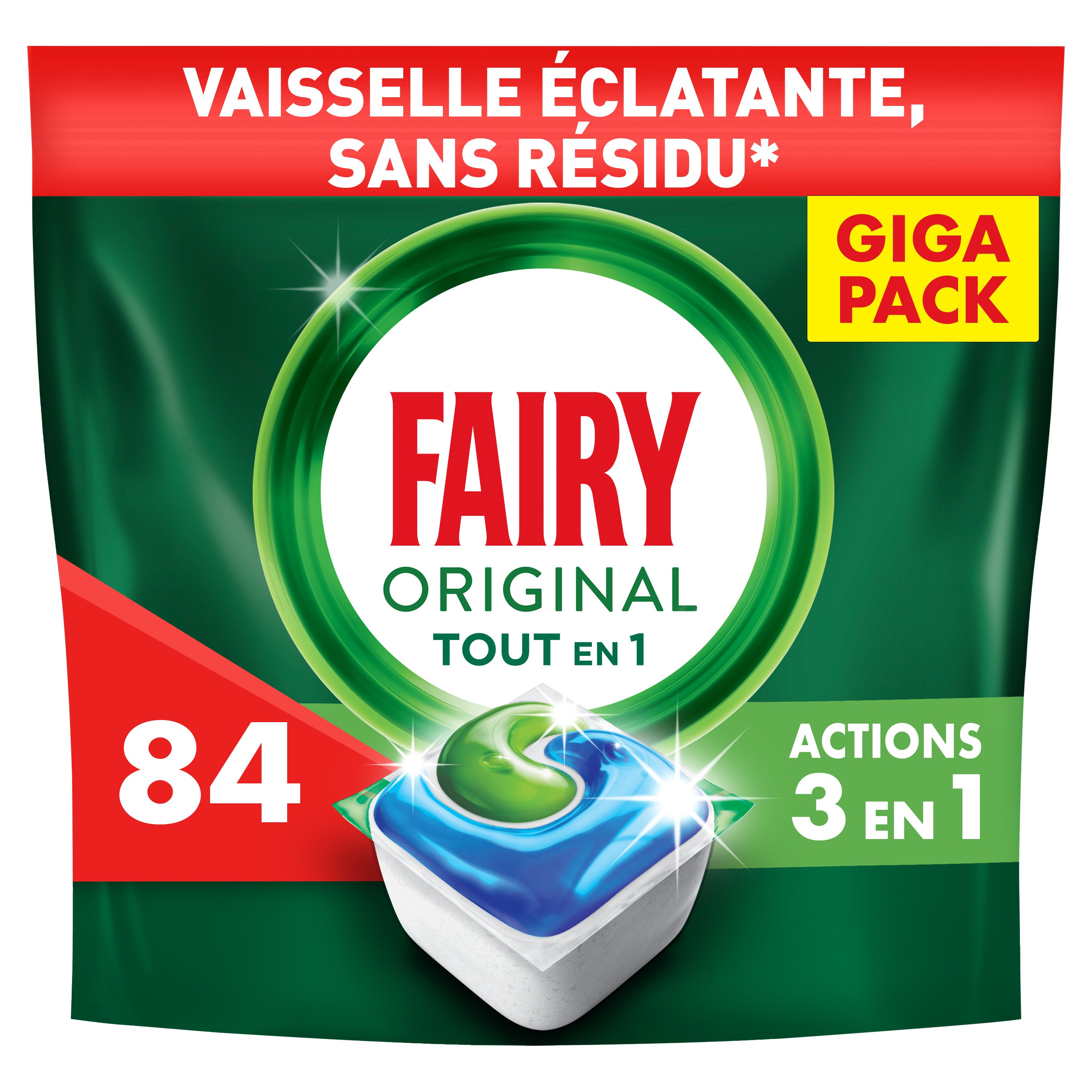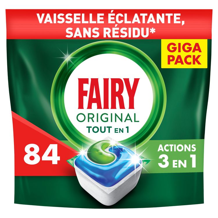 Les tablettes lave-vaisselle All in One Fairy Original nettoient dès le premier lavage. Elles sont même efficaces sur la graisse incrustée, pour une vaisselle éclatante. Fairy associe du liquide et de la poudre dans des capsules performantes. Leur sachet ultra-soluble se dissout rapidement, pour commencer à nettoyer sans délai. Et elles sont faciles à utiliser. Pas besoin de les déballer, placez-les simplement dans votre compartiment pour produit lave-vaisselle.
