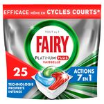 Les tablettes lave-vaisselle Fairy Platinum All in One Technologie Propreté Intenseoffrent un nettoyage approfondi pour une vaisselle comme neuve et liminent les résidus alimentaires difficiles. Fairy Platinum Plus vous offre un nettoyage exceptionnel qui élimine les taches tenaces, même avec une vaisselle extrêmement sale pendant un cycle court. Vous n'avez pas le temps ? Pas de souci. Optez pour un cycle court. Fairy associe du liquide et de la poudre dans des capsules performantes. Leur sachet ultra-soluble se dissout rapidement et convient aux cycles courts, pour commencer à nettoyer sans délai. Et elles sont faciles à utiliser. Pas besoin de les déballer, placez-les simplement dans votre compartiment pour produit lave-vaisselle.