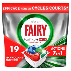 Les tablettes lave-vaisselle All in One Fairy Platinum Plus avec la Technologie Anti-terne lavent pour une vaisselle comme neuve. Elles offrent une action nettoyante Fairy optimale et éliminent l'apparence terne qui s'installe avec le temps pour une vaisselle éclatante comme au premier jour. Fairy Platinum Plus vous offre un nettoyage exceptionnel qui élimine les taches tenaces, même avec une vaisselle extrêmement sale pendant un cycle court. Vous n'avez pas le temps ? Pas de souci. Optez pour un cycle court. Fairy associe du liquide et de la poudre dans des capsules performantes. Leur sachet ultra-soluble se dissout rapidement et convient aux cycles courts, pour commencer à nettoyer sans délai. Et elles sont faciles à utiliser. Pas besoin de les déballer, placez-les simplement dans votre compartiment pour produit lave-vaisselle.