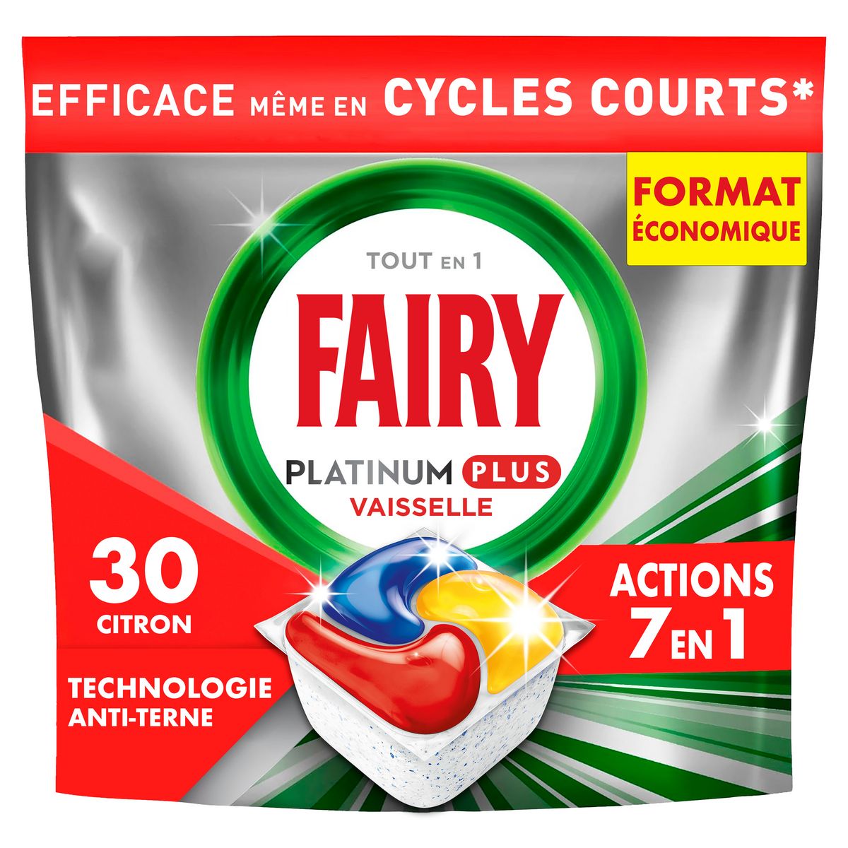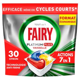 Les tablettes lave-vaisselle All in One Fairy Platinum Plus lavent pour une vaisselle comme neuve. Elles offrent une action nettoyante Fairy optimale et éliminent l'apparence terne qui s'installe avec le temps pour une vaisselle éclatante comme au premier jour. Fairy Platinum Plus vous offre un nettoyage exceptionnel qui élimine les taches tenaces, même avec une vaisselle extrêmement sale pendant un cycle court. Vous n'avez pas le temps ? Pas de souci. Optez pour un cycle court. Fairy associe du liquide et de la poudre dans des capsules performantes. Leur sachet ultra-soluble se dissout rapidement et convient aux cycles courts, pour commencer à nettoyer sans délai. Et elles sont faciles à utiliser. Pas besoin de les déballer, placez-les simplement dans votre compartiment pour produit lave-vaisselle. Optez pour un cycle court* au lieu d'un cycle normal et économisez du temps, de l'énergie et de l'eau !
