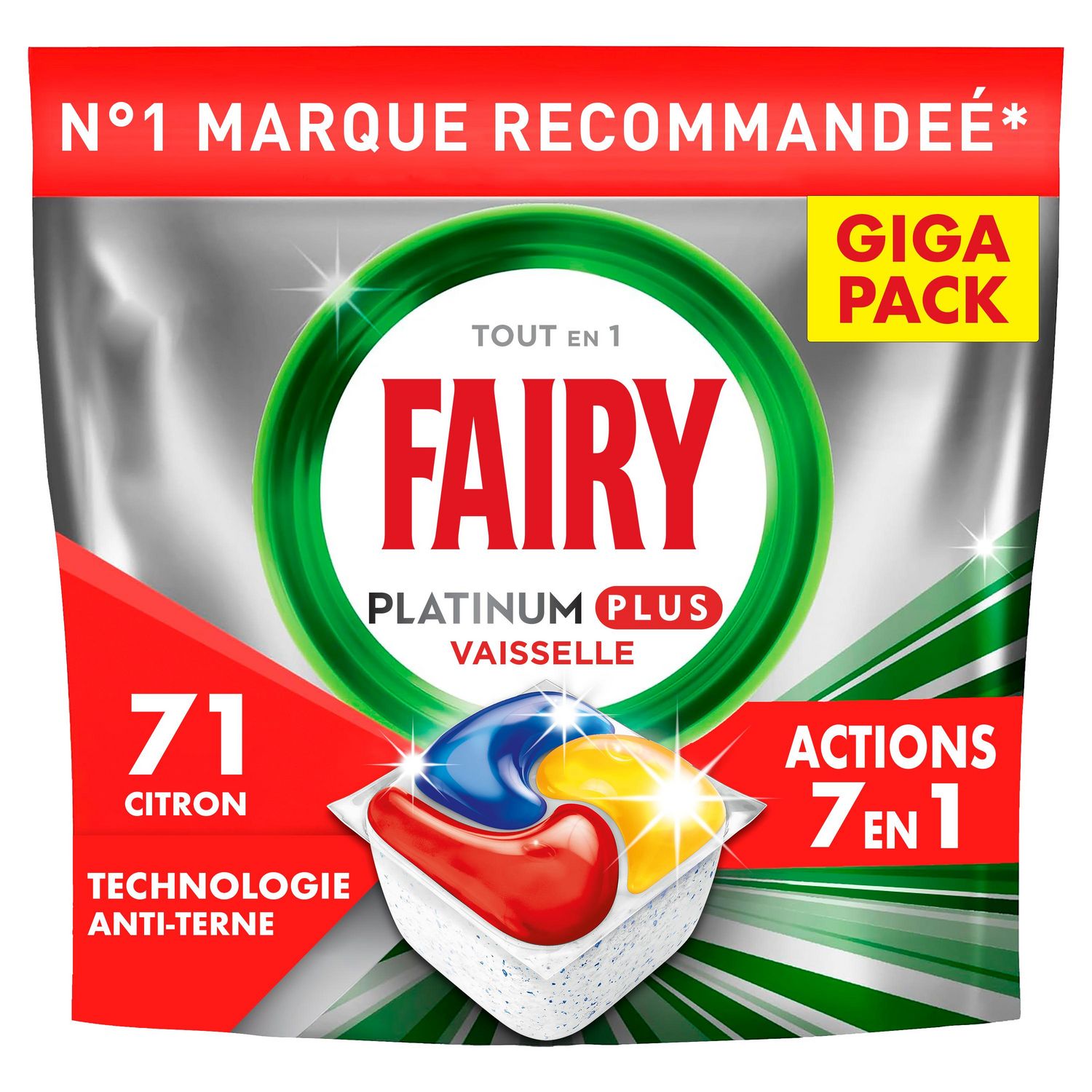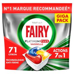 Les tablettes lave-vaisselle All in One Fairy Platinum Plus avec la Technologie Anti-terne lavent pour une vaisselle comme neuve. Elles offrent une action nettoyante Fairy optimale et éliminent l'apparence terne qui s'installe avec le temps pour une vaisselle éclatante comme au premier jour. Fairy Platinum Plus vous offre un nettoyage exceptionnel qui élimine les taches tenaces, même avec une vaisselle extrêmement sale pendant un cycle court. Vous n'avez pas le temps ? Pas de souci. Optez pour un cycle court. Fairy associe du liquide et de la poudre dans des capsules performantes. Leur sachet ultra-soluble se dissout rapidement et convient aux cycles courts, pour commencer à nettoyer sans délai. Et elles sont faciles à utiliser. Pas besoin de les déballer, placez-les simplement dans votre compartiment pour produit lave-vaisselle. Optez pour un cycle court* au lieu d'un cycle normal et économisez du temps, de l'énergie et de l'eau !