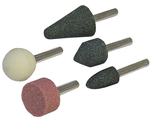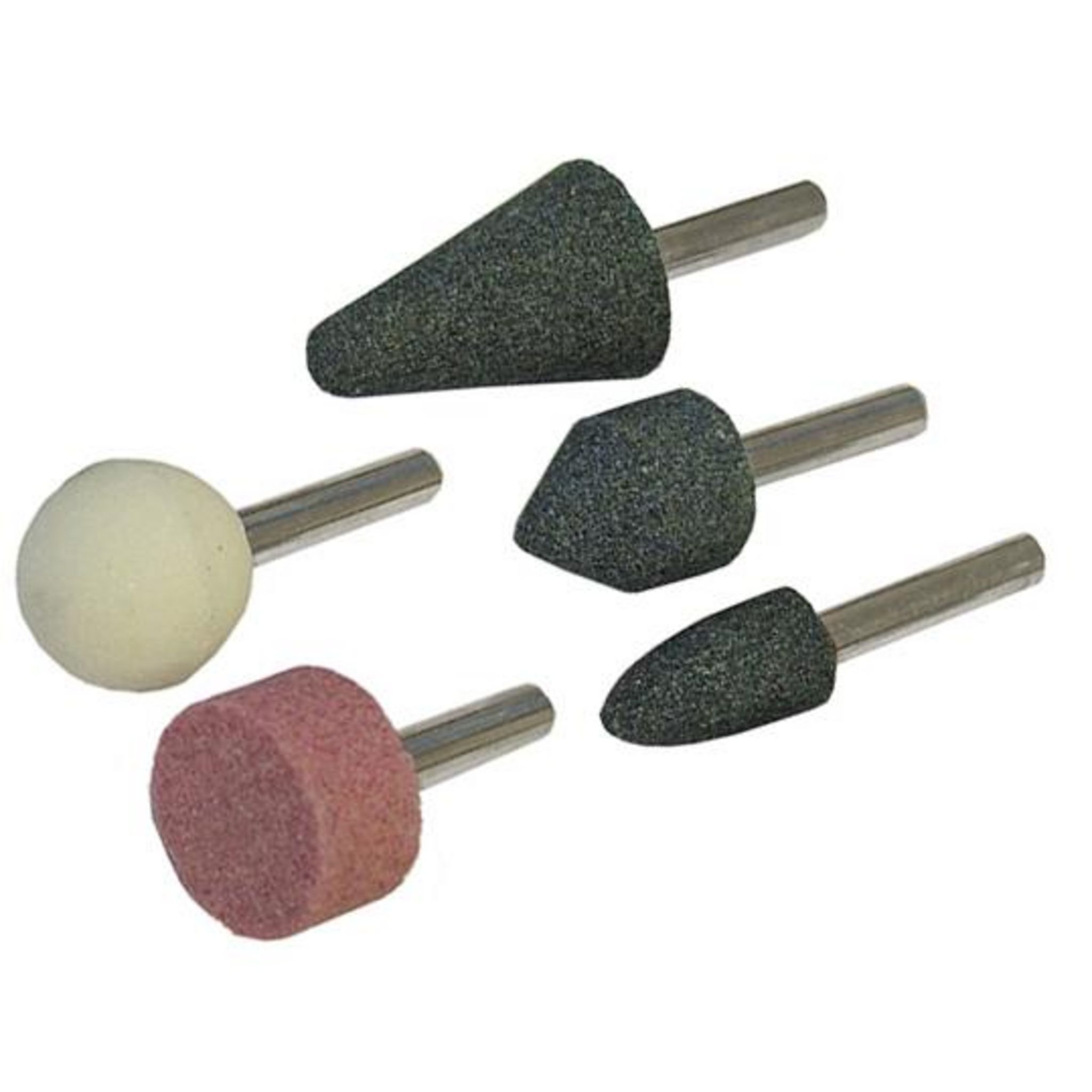 Jeu de 5 meules corindon sur tige de diamètre 6 mm compatible avec la plupart des perceuses électriques et visseuses sans fil. Idéales pour l',affûtage et le meulage d',acier.