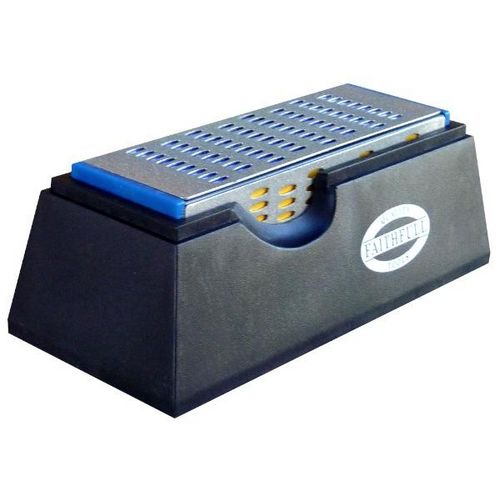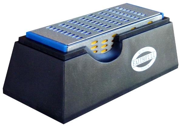 Pierre d',affûtage 4 grains (un grain par face). Livrée en dans son support en plastique. Permet un affûtage de précision et d&rsquo,une grande efficacité de tous les outils HSS et carbure de tungstène, tels que les couteaux, ciseaux, fers de rabot, haches, cisailles, ...
