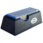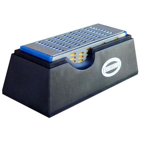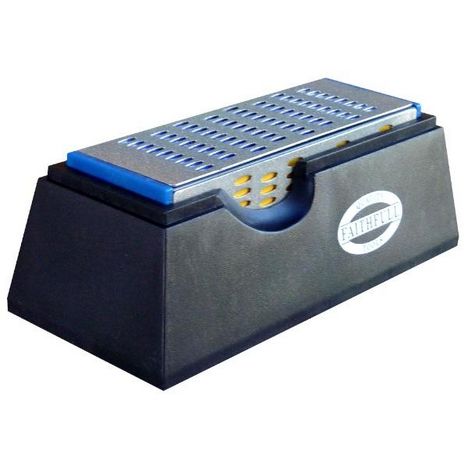 Pierre d',affûtage 4 grains (un grain par face). Livrée en dans son support en plastique. Permet un affûtage de précision et d&rsquo,une grande efficacité de tous les outils HSS et carbure de tungstène, tels que les couteaux, ciseaux, fers de rabot, haches, cisailles, ...Code couleur pour un repé