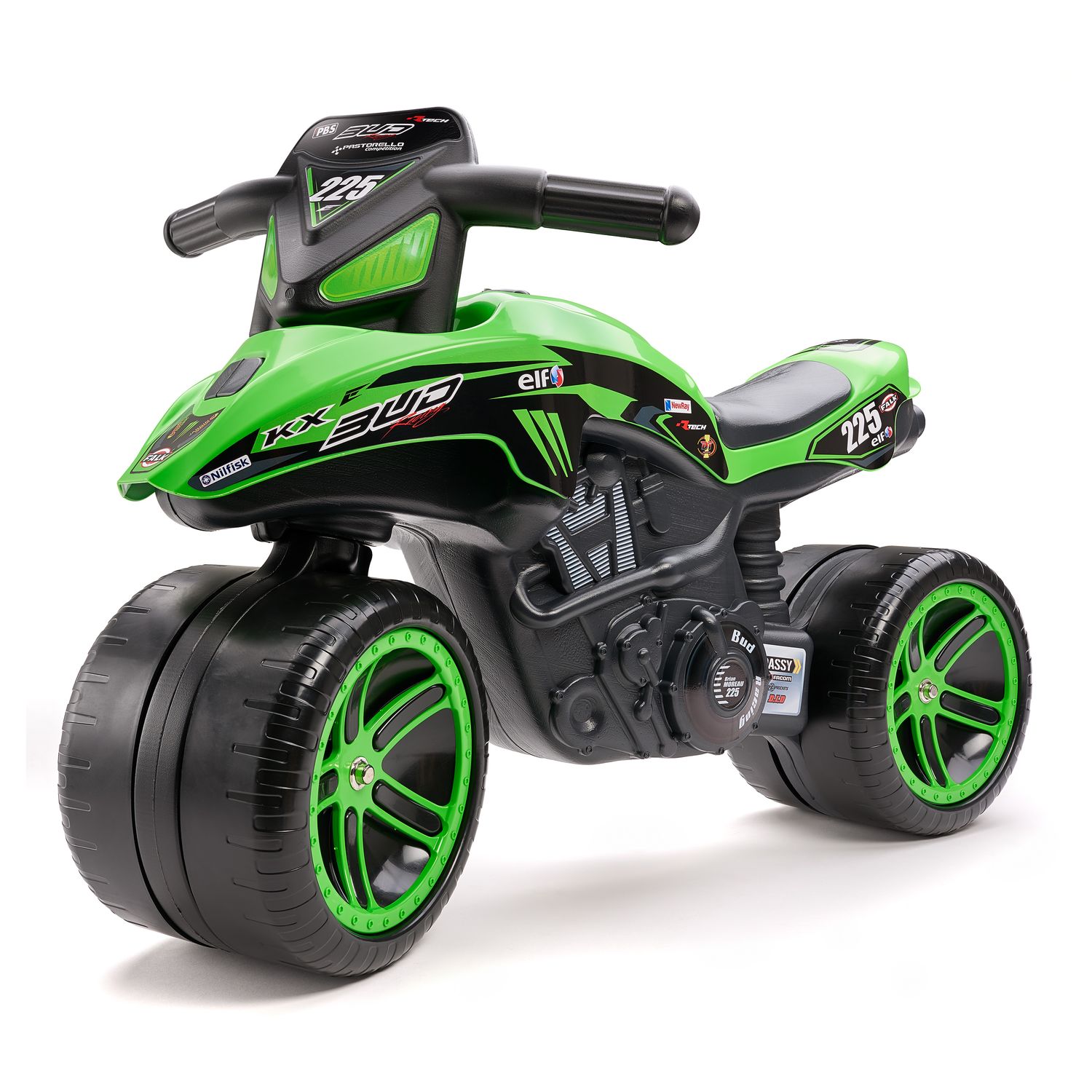 Ce Porteur Moto Kawasaki Bud Racing vert de type draisienne est équipé de larges roues et d’un guidon directionnel, 100% made in France, pour les enfants de 2 à 5 ans en quête de sensations fortes. Cette réplique de la moto cross de Grand Prix de Brian Moreau comprend des larges roues qui appo