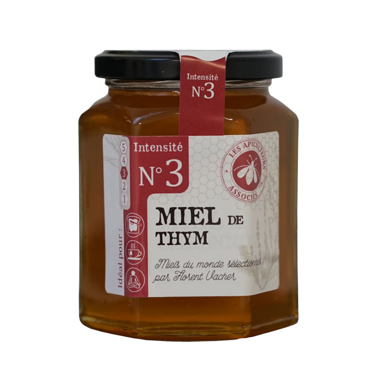 LE MIEL DE THYM A UNE COULEUR AMBREE ET UNE SAVEURTRES PRONONCEE, ASSEZ BOISEE