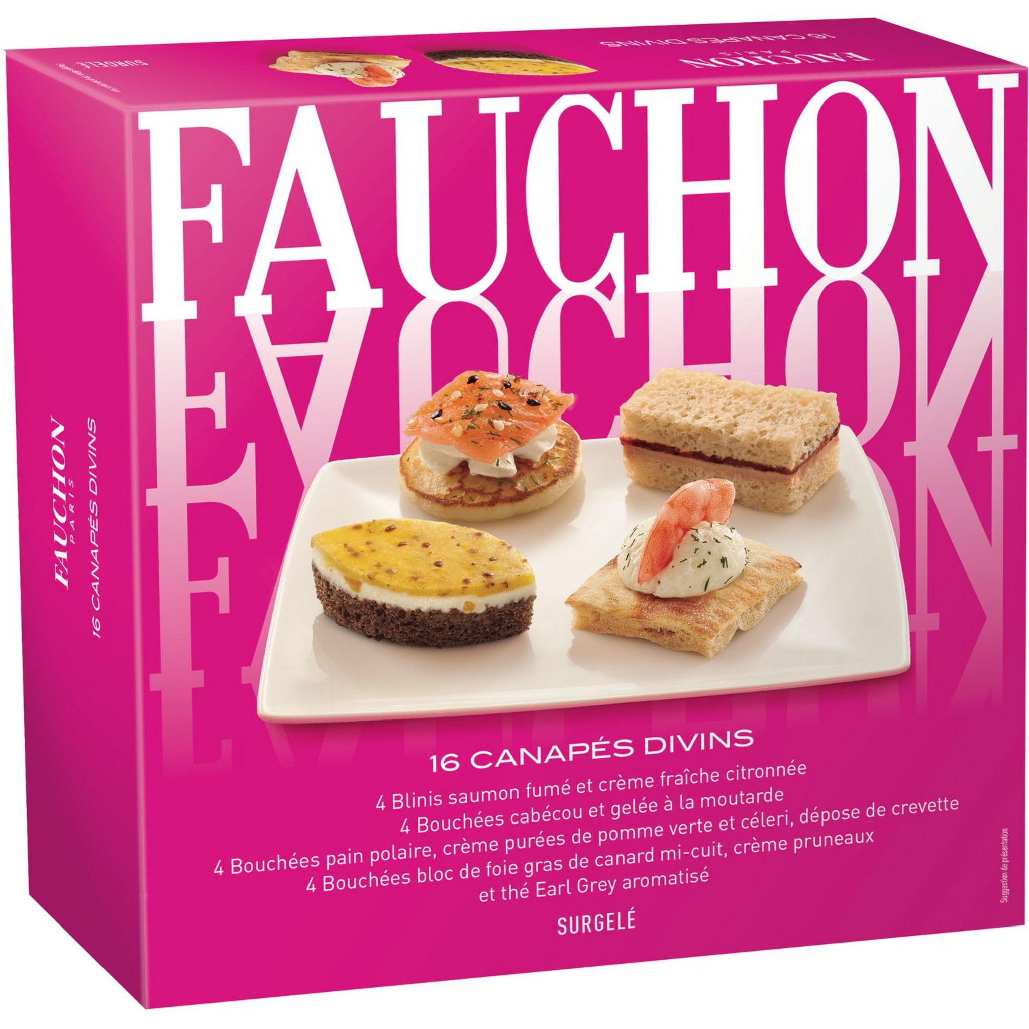 GARNITURES (57,4%) : Fromage frais foisonné (fromage (babeurre, LAIT écrémé, crème, protéines de LAIT, babeurre déshydraté, ferments lactiques), sel), préparation à base de betteraves 11,2% (purée de betterave rouge 34,2% (betterave, vinaigre, sel), oignons, betterave rouge 23,7%, vinaigre balsamique 1,1% (vinaigre de vin, moût de raisin, colorant : E150d, sulfites), beurre), saumon fumé 10,8% (Salmo salar, sel), fromage blanc, crème fraîche 8,7%, pièce de porc crue maturée séchée 8,6% (NOIX de jambon de porc, sel, poivre, sucres : dextrose et lactose, ferments, conservateurs : E252 et sel nitrité, antioxydant : E301), Comté 7,8%, préparation à base de pommes 7,5% (pomme 77,4% (pomme, antioxydant : E300), eau, sucre, poivre blanc), bloc de foie gras de canard 7,1% (foie gras de canard, eau, Armagnac, sel nitrité, sucre, poivre, antioxydant : E301), purée de framboise sucrée 4,9% (framboise 90%, sucre), roquette 1,8%, eau, NOIX 1,1%, pistache 1,1%, préparation à base de basilic 1% (huile de tournesol, basilic 34%, fromage (LAIT, sel, présure), sel, jus de citron concentré, ail), ciboulette, miel 0,5%, MOUTARDE à l'ancienne 0,5% (vinaigre d'alcool, graines de MOUTARDE et téguments (contient conservateur : E224-sulfites), eau, sel, acidifiant : E330, épices (CÉLERI)), sucre, SÉSAME décortiqué, SÉSAME noir, amidon modifié de tapioca, épaississants : E410 et E415, protéines de LAIT, piment en poudre, jus de citron concentré, sel, aneth, mélange 5 baies en poudre (poivre noir, poivre blanc, poivre vert, piment du Mexique, baies roses), poivre. SUPPORTS (42,6%) (plaque de viennoiserie jaune lin brun et flocons de SEIGLE, plaque de viennoiserie rose, mini blinis, pain polaire) : Farine de BLÉ (contient farine de BLÉ malté), mini blini 22,4% (eau, farine de BLÉ, huile de tournesol, lactose, protéines de LAIT, LAIT écrémé en poudre, lactosérum en poudre, ŒUF entier et blanc d'ŒUF déshydratés, poudre à lever : E500ii et E450i, sel, antioxydant : E300), pain polaire 20,4% (farine de BLÉ, eau, farine de SEIGLE, sirop de sucre, sucre, GLUTEN de BLÉ, huile de colza, fibres de betterave, sel, farine de froment fermentée, levure, émulsifiants : E471 et E472e, poudre à lever : E503ii, fructose, agent de traitement de la farine : E300, enzyme), eau, huile de tournesol, levure, sucre, graine de lin brun 1%, flocon de SEIGLE 0,6%, sel, poudre de LAIT écrémé, préparation lactée (lactosérum, matières grasses de coprah, LAIT écrémé, protéines de LAIT), farine de fève, GLUTEN de BLÉ, colorants : E120 et E161b, émulsifiants : E471 et E481, acidifiant : E330, antioxydant : E300.