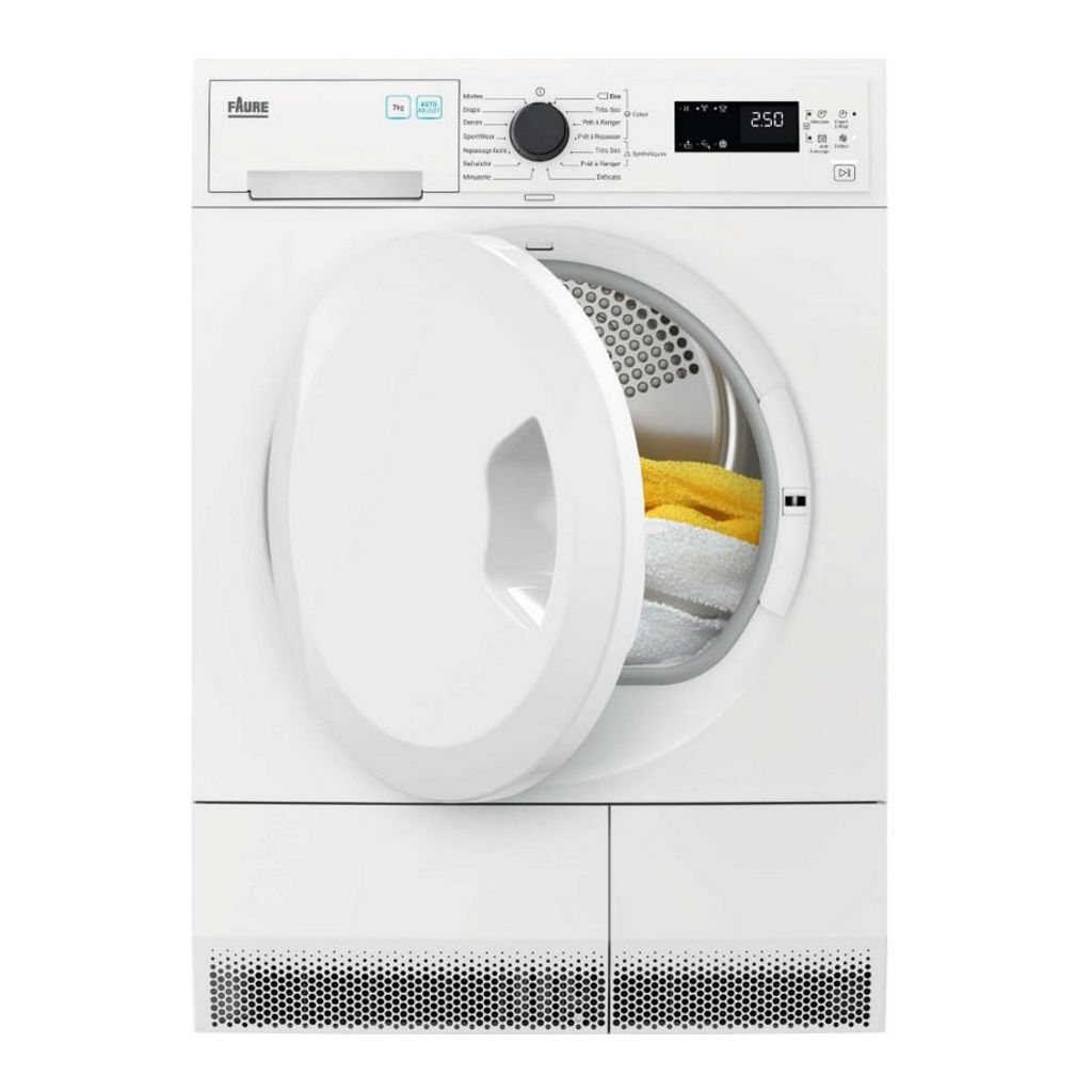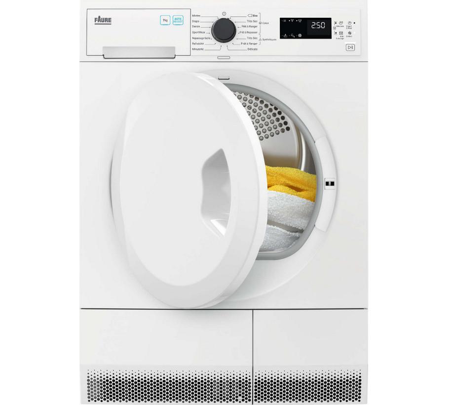 En savoir +Faure FDP7406PZ Sèche-linge à condensation Faure FDP7406PZ avec gain de temps et d'énergie à chaque charge. Réduisez la consommation d'énergie lors du séchage, tout en évitant un surséchage grâce aux capteurs intelligents AutoAdjust. Ils détectent le degré d'humidité dans le tambour, déterminant ainsi la durée idéale de chaque cycle.Gagnez du temps et économisez de l'énergie avec AutoAdjust : AutoAdjust utilise des capteurs intelligents placés dans le tambour pour détecter le degré d'humidité du linge, déterminant ainsi la durée idéale du cycle pour que votre linge soit séché tout en douceur.Moins de plis avec Repassage facile :Avec le programme Repassage facile, vous écourtez le temps de repassage après avoir sorti vos vêtements du tambour. Le séchage à rotation inverse permet aux vêtements de bouger librement, ce qui les empêche de s'enchevêtrer. Cela réduit les plis et permet de sécher le linge uniformément.Séchez vos cotons et synthétiques en une seule fois :Séchez vos cotons et synthétiques en une seule fois avec le programme Mixtes. Les charges mixtes seront séchées uniformément et efficacement sans compromettre les résultats. Moins de tri, plus de temps pour vous.Gagnez du temps avec le Départ différé :Faites sécher votre linge en fonction de votre agenda avec la fonction Départ différé. Réglez l'heure sur votre appareil et le cycle commencera automatiquement à votre convenance, même en votre absence. Cette fonction utile permet de sécher facilement votre linge quand cela vous convient.Hublot réversible :Ne laissez plus la disposition de votre cuisine, de votre salle de bains ou de votre buanderie vous dicter où placer votre sèche-linge. En faisant tourner le cadre du hublot, il est possible de l'ouvrir dans deux positions différentes. Vous êtes donc libre de l'installer là où vous en avez envie.