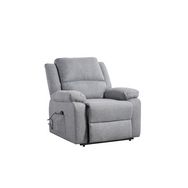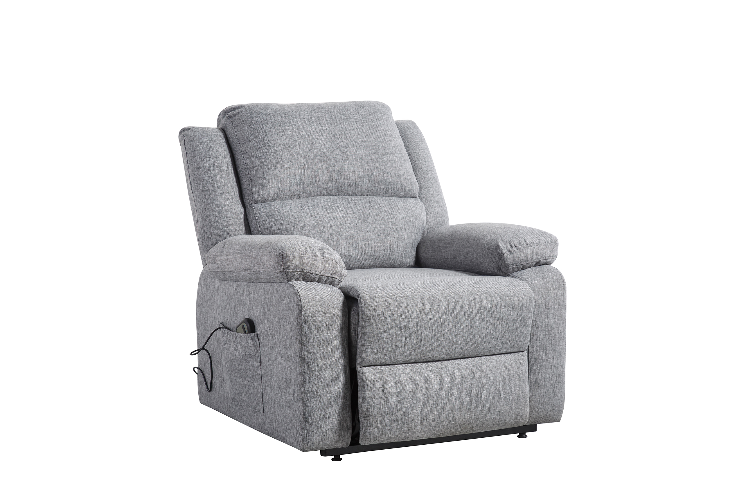 Fauteuil relaxation electrique releveur, le dossier s'incline jusqu'à 170°, repose-pieds intégrés. Fonction releveur simplifiant l'acces au fauteuil ideal pour les personnes agées. Moteur éléctrique, avec télécommande. Construction en bois massif, contreplaqué, métal, mousse, ressorts ensachés. Finition tissu coloris gris clair. Entretien facile. Design urbain. Poids max ;200 kilos