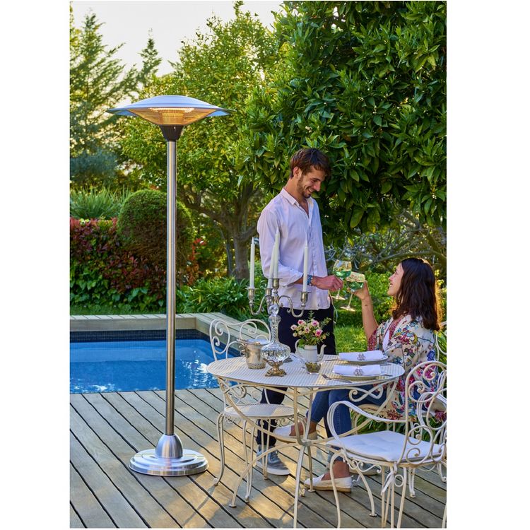 Ce parasol chauffant électrique BRESCIA prolongera vos nuits d'été grâce à sa surface de chauffe de 7 à 9 m². Conçu pour un usage en intérieur ou extérieur, ce parasol chauffant électrique vous fera profiter de ses 3 puissances de chauffe 1200/1800/3000W. Ce chauffage d'extérieur électrique BRESCIA est équipé d'une structure en inox brossé et d'un réflecteur en aluminium 76 cm pour vous apporter un maximum de chaleur. Livré avec son câble d'alimentation de 1.8m et d'un système coupe circuit, ce parasol chauffant électrique est fonctionnel et n'attend que vous pour être utilisé !