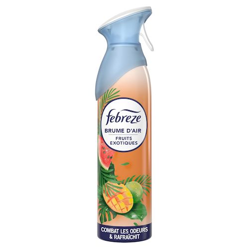 Le spray désodorisant Febreze combat les odeurs tenaces et persistantes et laisse un léger parfum frais grâce à la technologie OdourClear. Le parfum Fruits Exotiques s'inspire d'un mélange unique de fruits exotiques, à déguster sur une plage bordée de palmiers. Vaporisez-le partout dans la maison pour combattre les odeurs et rafraîchir. Le désodorisant Febreze est non inflammable et existe dans une large gamme de parfums.