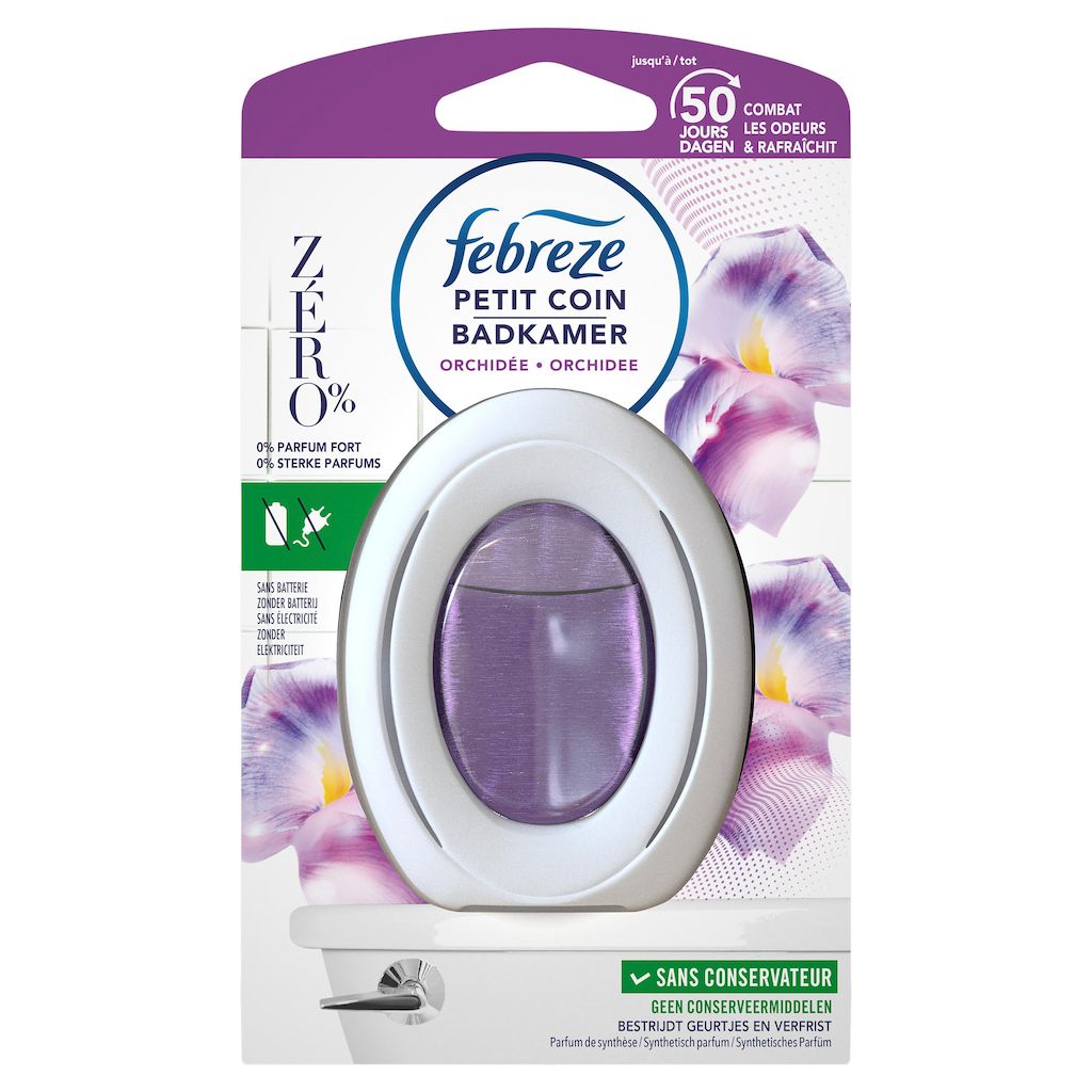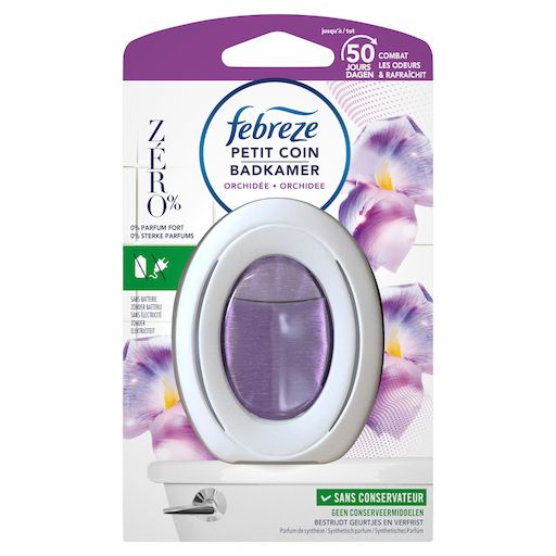 Notre premier désodorisant pour salle de bains et toilettes non électrique en continu, Febreze Petit Coin élimine non seulement les odeurs de l'air, mais il empêche également qu'elles ne se déposent sur les surfaces souples telles que les serviettes, les tapis de bains et les rideaux de douche. Febreze Petit Coins utilise sa technologie unique anti-odeurs ClearTM qui diffuse une fraîcheur continue jusqu'à 50 jours, pour que votre salle de bains soit toujours prête à accueillir vos clients. Pratique et facile à utiliser, Febreze Petit Coin fonctionne sans électricité ni piles et se décline dans différents parfums.