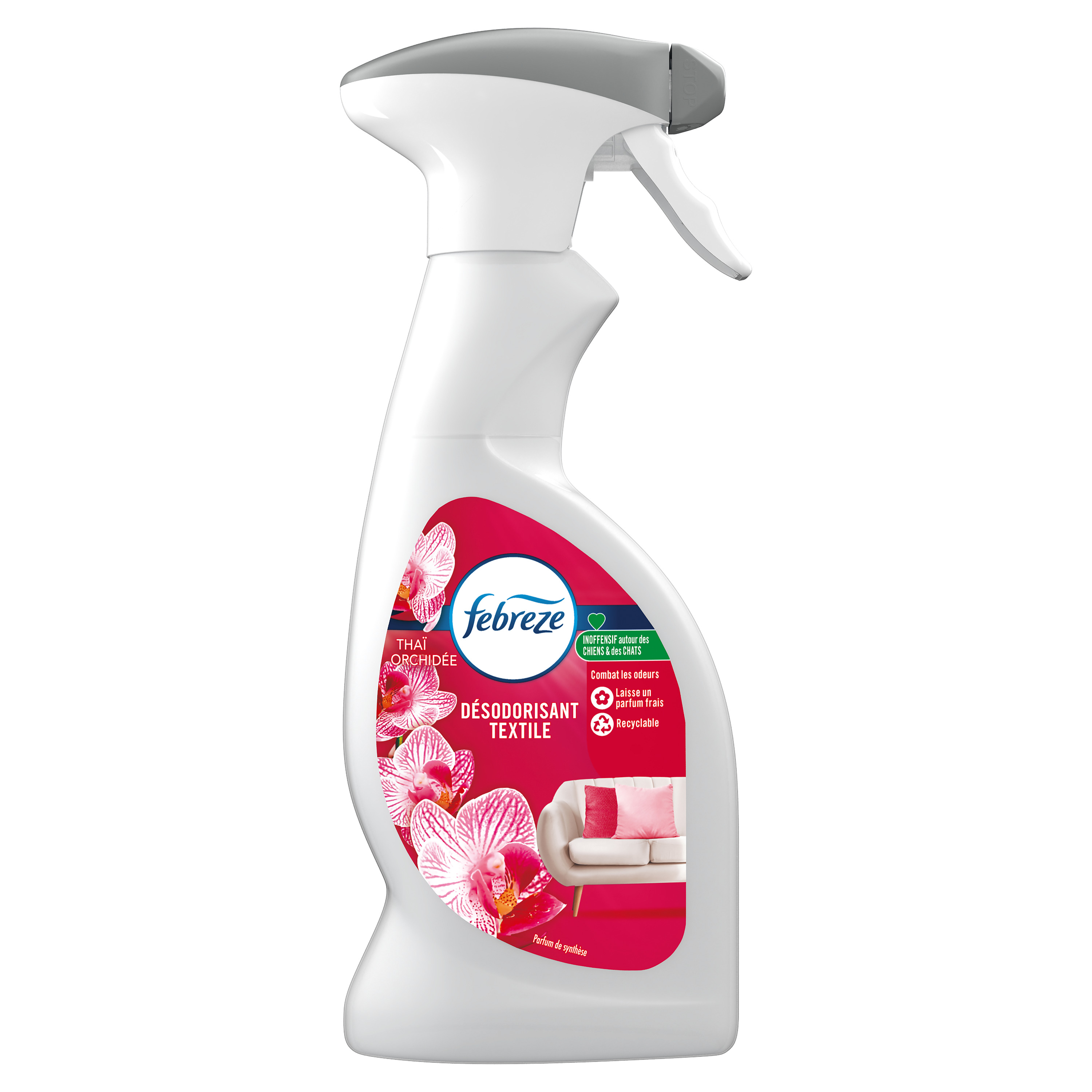 Découvrez le parfum Thaï Orchidée, un mélange unique de fleurs exotiques dans lequel les orchidées incarnent l'harmonie et l'équilibre délicats de la nature. Le désodorisant textile Febreze Thaï Orchidée doté de la technologie OdourClear élimine les odeurs persistantes emprisonnées dans les tissus et laisse un parfum frais. Le désodorisant textile Febreze est une bouffée d'air frais pour les tissus difficiles à laver comme les couvertures, rideaux et tapis. Les désodorisants textiles Febreze sont testés dermatologiquement et peuvent être utilisés en toute sécurité près des animaux domestiques. Essayez aussi les désodorisants électriques Febreze 3Volution, qui éliminent complètement les odeurs jusqu'à 90 jours.