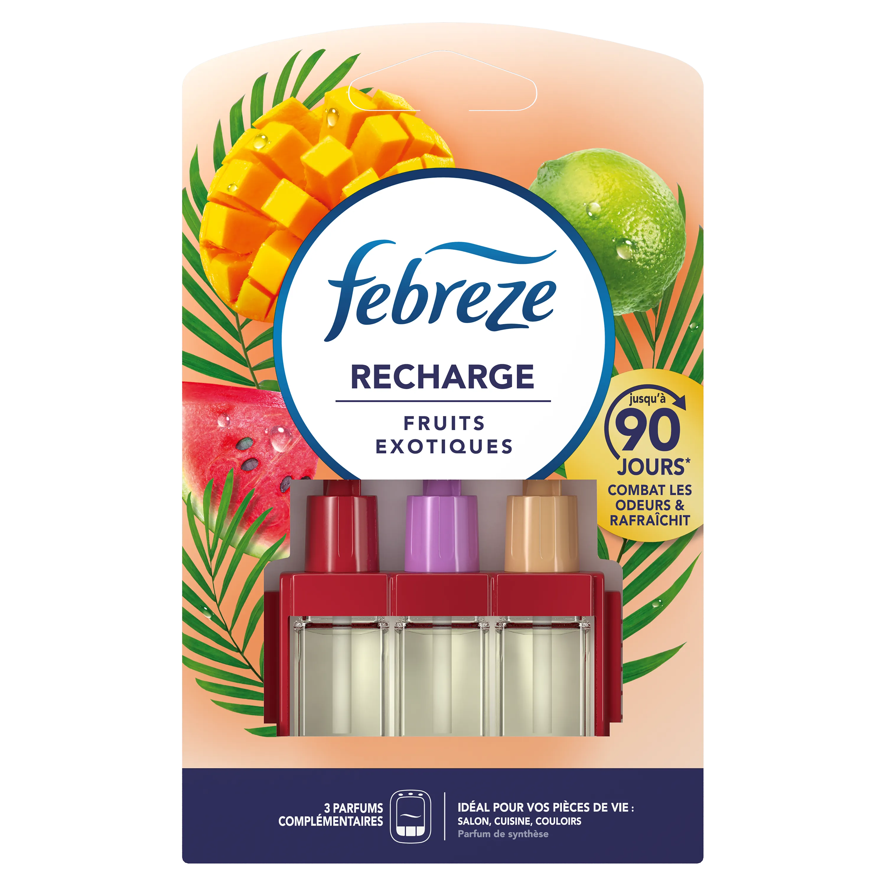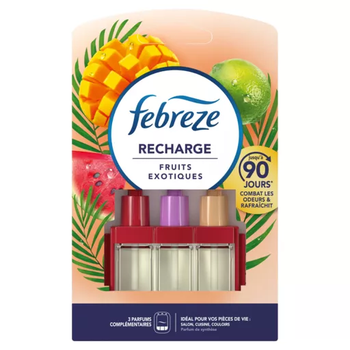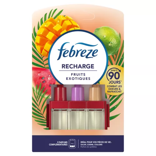 Febreze 3Volution Fruits Exotiques combat les odeurs en continu et alterne entre 3 parfums complémentaires pour une fraîcheur qui dure longtemps. Dure jusqu'à 90 jours (en cas d'une utilisation 12 heures par jour à réglage minimum). . Laissez le calme vous envelopper tandis que ce parfum doux et sain se répand dans l'air. Avec les diffuseurs classiques, nous nous habituons rapidement à leurs parfums et finissons par ne plus les sentir. Febreze 3Volution renouvelle la fraîcheur en alternant automatiquement entre 3 parfums complémentaires et de haute qualité toutes les 45 minutes. Utilisez les recharges Febreze 3Volution avec le diffuseur électrique 3Volution pour emplir votre maison d'un parfum frais que vous sentirez à chaque instant. Avec 3Volution, réglez le niveau d'intensité de parfum et créez l'ambiance que vous voulez, quand vous voulez.