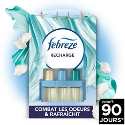 Febreze 3Volution Linge Frais combat les odeurs en continu et alterne entre 3 parfums complémentaires pour une fraîcheur qui dure longtemps. Dure jusqu'à 90 jours (en cas d'une utilisation 12 heures par jour à réglage minimum). . Laissez le calme vous envelopper tandis que ce parfum doux et sain se répand dans l'air. Avec les diffuseurs classiques, nous nous habituons rapidement à leurs parfums et finissons par ne plus les sentir. Febreze 3Volution renouvelle la fraîcheur en alternant automatiquement entre 3 parfums complémentaires et de haute qualité toutes les 45 minutes. Utilisez les recharges Febreze 3Volution avec le diffuseur électrique 3Volution pour emplir votre maison d'un parfum frais que vous sentirez à chaque instant. Avec 3Volution, réglez le niveau d'intensité de parfum et créez l'ambiance que vous voulez, quand vous voulez.