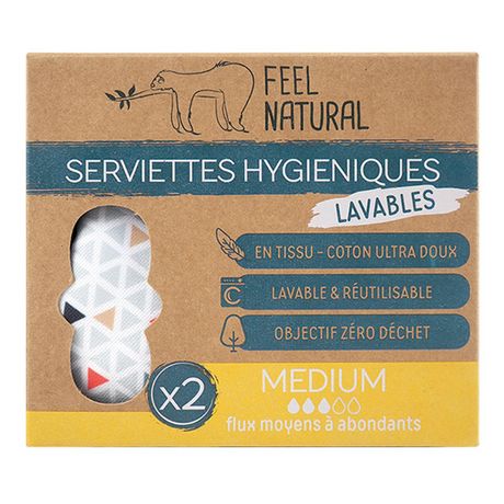 Nos serviettes hygiéniques Feel Natural lavables sont réutilisables jusqu'à 3 ans. Economiques, discrètes et absorbantes, elles remplaceront les serviettes jetables. Grâce à leurs boutons pressions, elles sont adaptables à différentes largeurs de sous vêtements. Pratiques, elles se plient et se rangent en toute discrétion.