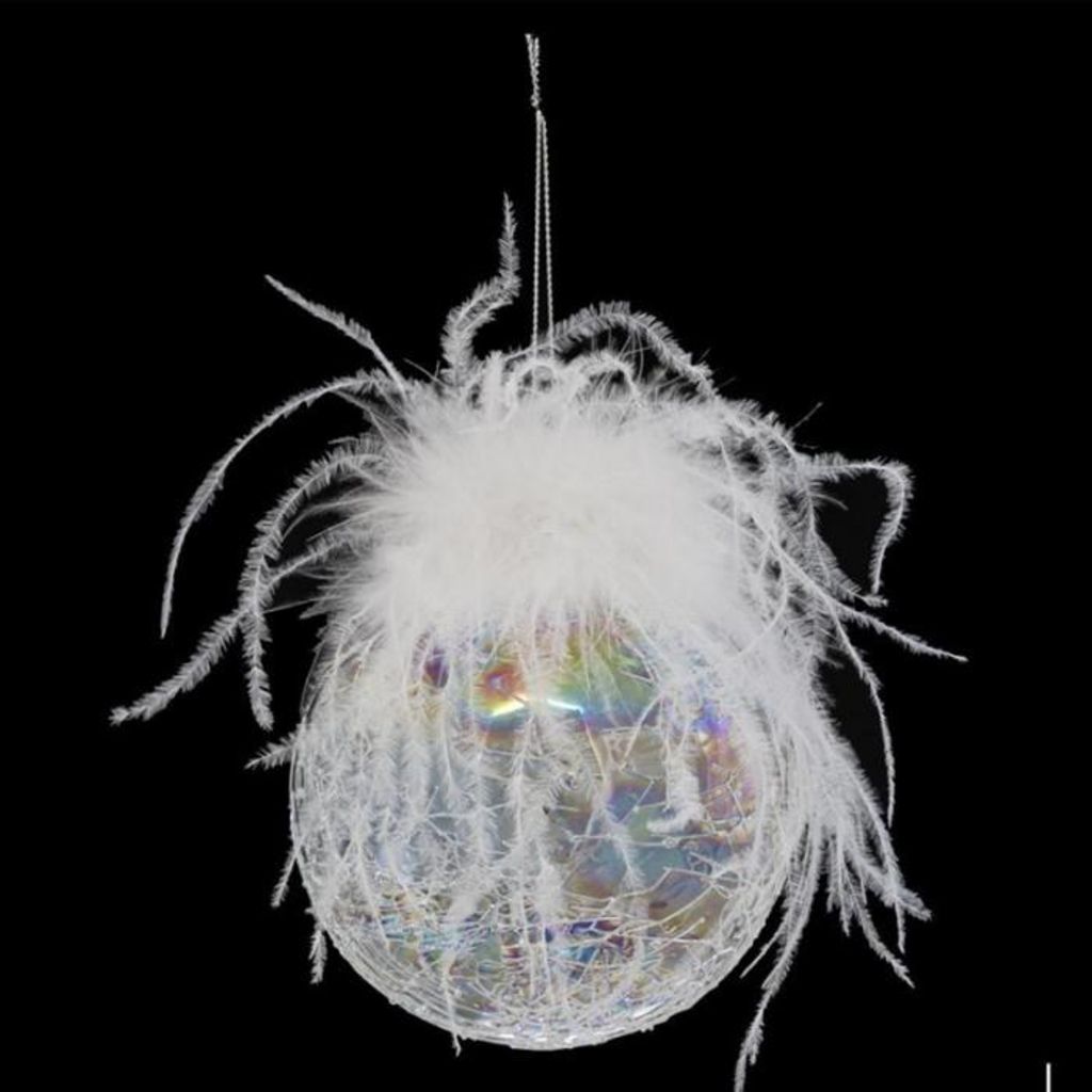 Informations Techniques : Dimensions : D. 10 cm Matière : Verre Spécificités : Pratique & Utile Boule de Noël Forme Ronde Effet Irisé Avec Plumes Poids : 0,058 kg Couleur : Blanc