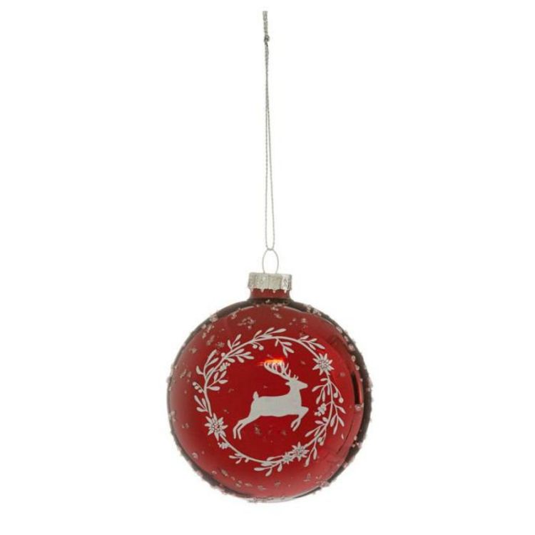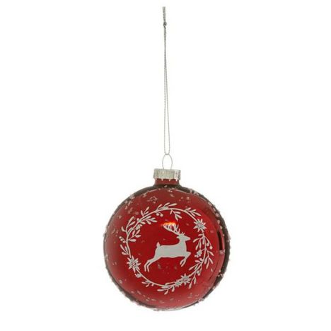Informations Techniques : Dimensions : D. 8 cm Matière : Verre Spécificités : Pratique & Utile Boule de Noël Forme Ronde Motif Renne Couronne de Feuille Poids : 0,027 kg Couleur : Rouge