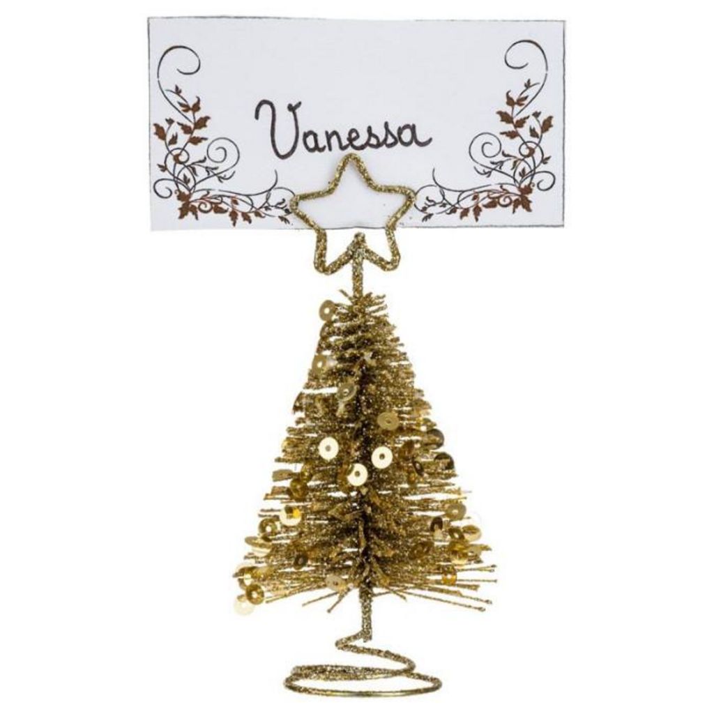 Informations Techniques : Dimensions : D. 5 x H. 10 cm Matière : Métal Spécificités : Pratique & Utile Cavalier de Table Forme Sapin Design Paillettes Poids : 0,015 kg Couleur : Or