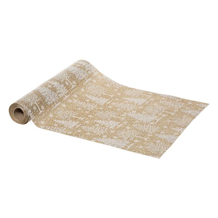 Informations Techniques : Dimensions : L. 28 x l. 300 cm Matière : Polyester Spécificités : Pratique & Utile Chemin de Table Forme Rectangulaire Imprimé Forêt Finition Paillettes Couleur : Naturel & Blanc