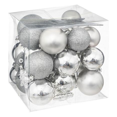 - Contient 26 Boules, 8 Flocons à suspendre et 1 cimier en forme d'étoile.